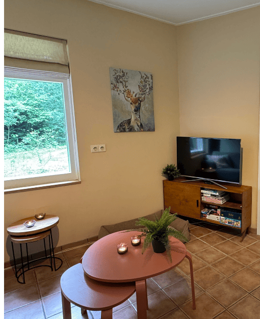 In de woonkamer kun je heerlijk relaxen op de bank of aan de eettafel genieten van een maaltijd met uitzicht op de natuur. Er is een tv aanwezig, en in de kast vind je verschillende spellen en boeken voor gezellige avonden samen.